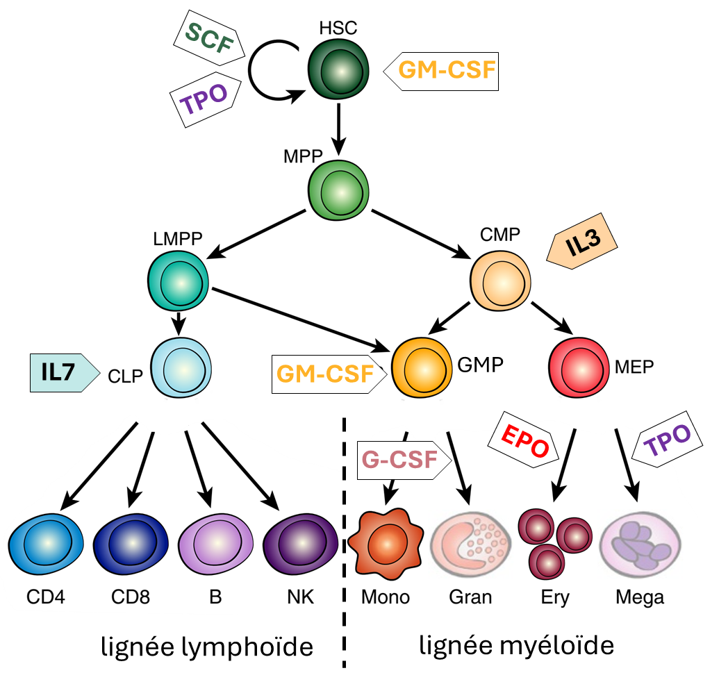 Le GM-CSF est une autre cytokine qui stimule un progéniteur un peu moins différencié, bipotent, qui peut se différencier en progéniteur des granulocytes ou en progéniteur des monocytes (GM-CSF = Granulocyte-Monocyte- CSF).
