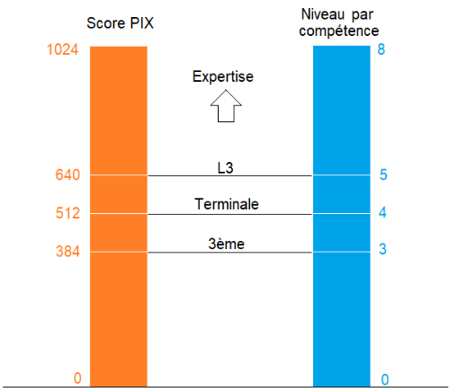 Si l'on regarde les niveaux attendus en fonction de la scolarité, on considère qu'un élève issu de la classe de 3ème devrait avoir un niveau 3 par compétence (soit un score PIX de 384), celui d'un élève en fin de terminale est 4 (score PIX 512) et en fin de cycle de licence, un étudiant devrait avoir un niveau par compétence égal à 5, soit un score PIX de 640.