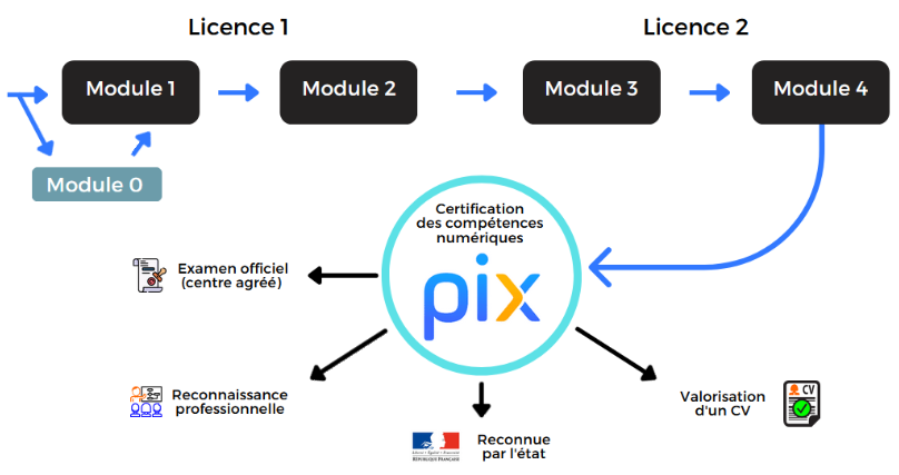 A chaque semestre S1 à S4 correspond un module de formation (module 1 à module 4) comportant chacun 4 à 5 TD + des tests de positionnement PIX (ces tests de positionnement ne sont qu'un entrainement à la certification finale).